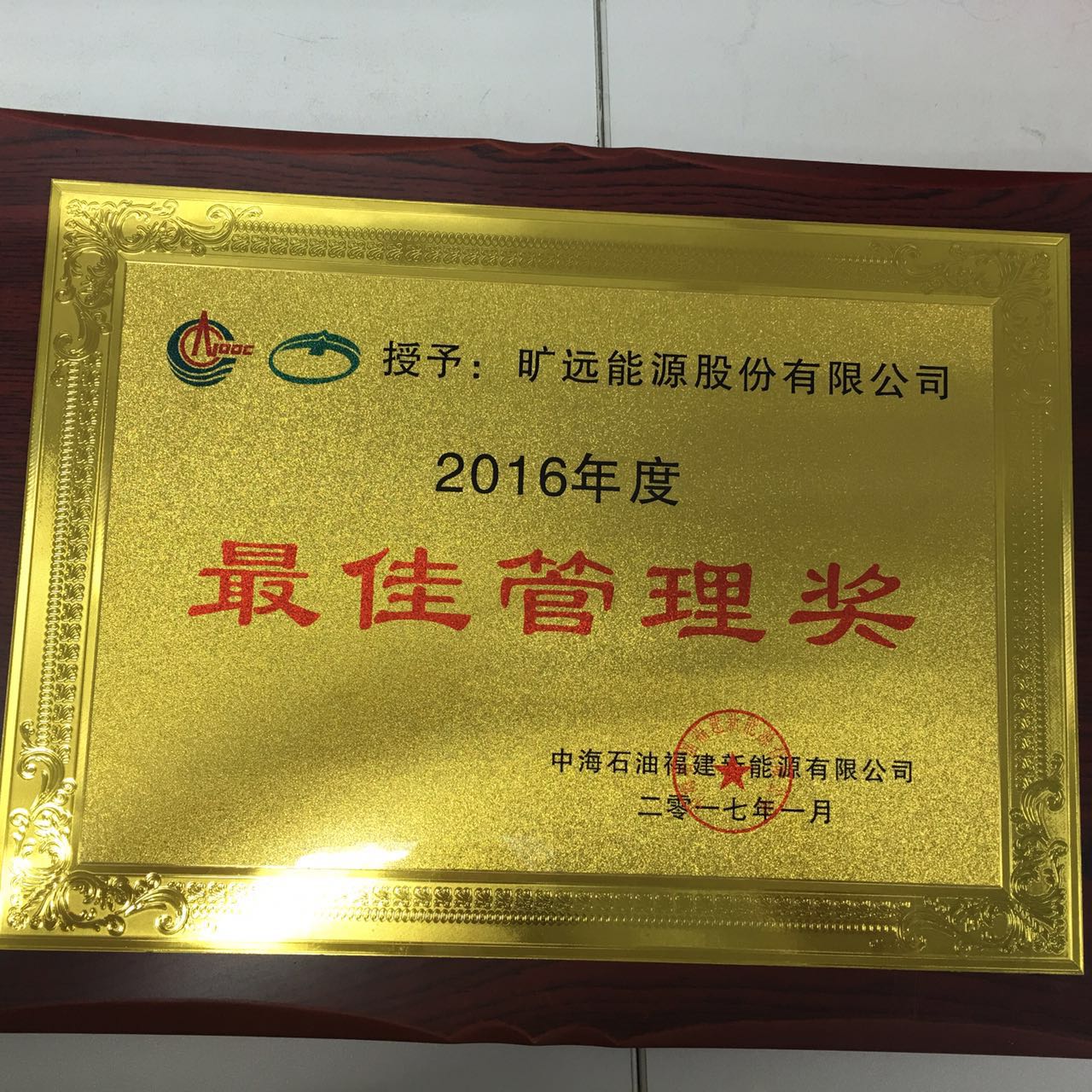 獲得中海石油福建新能源有限公司授予的“2016年度最佳管理獎”