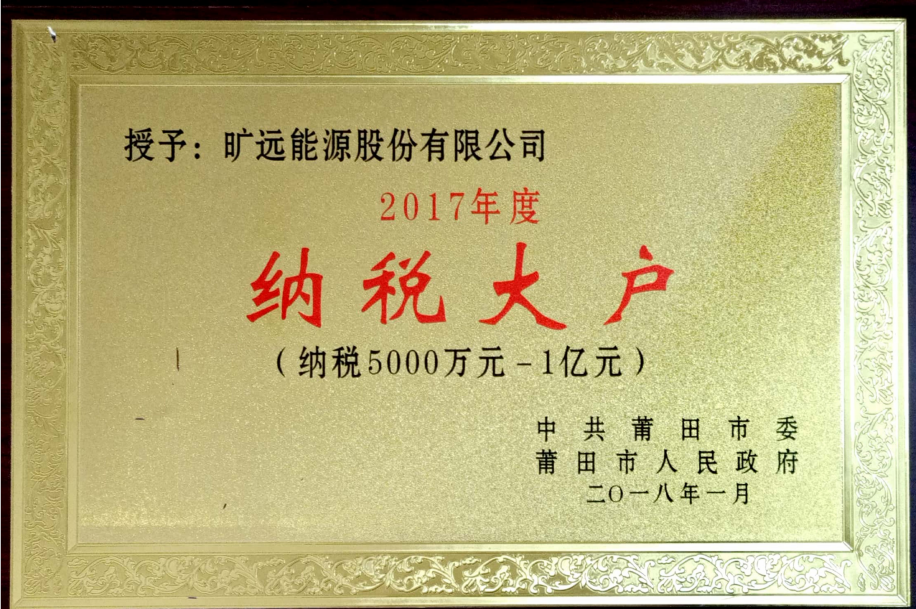 2018年01月 曠遠能源股份有限公司被中共莆田市委、莆田市人民政府授予“2017年度納稅大戶”榮譽稱號。