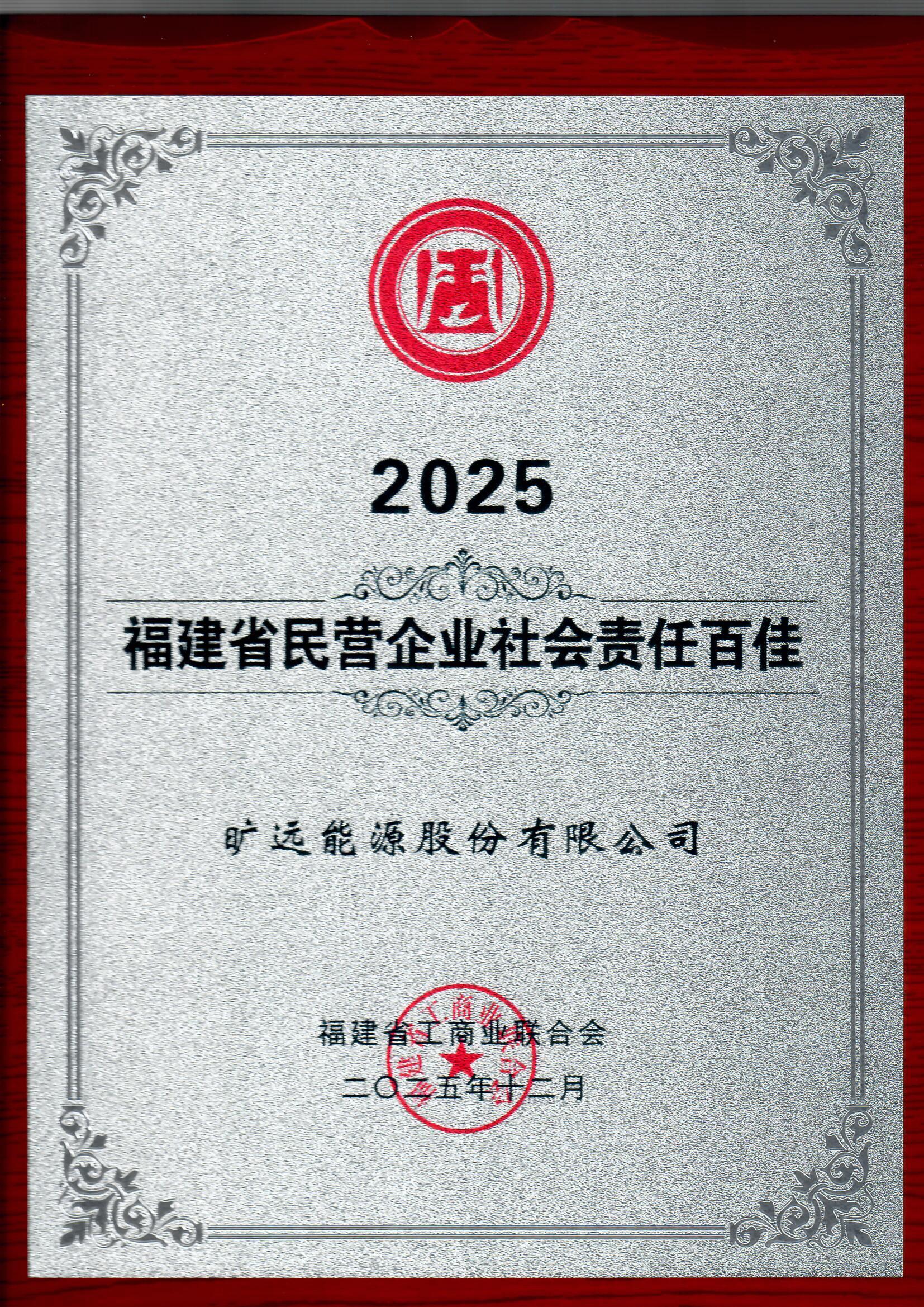 2025年12月 曠遠能源股份有限公司榮獲“福建省民營企業(yè)社會責(zé)任百佳”榮譽稱號