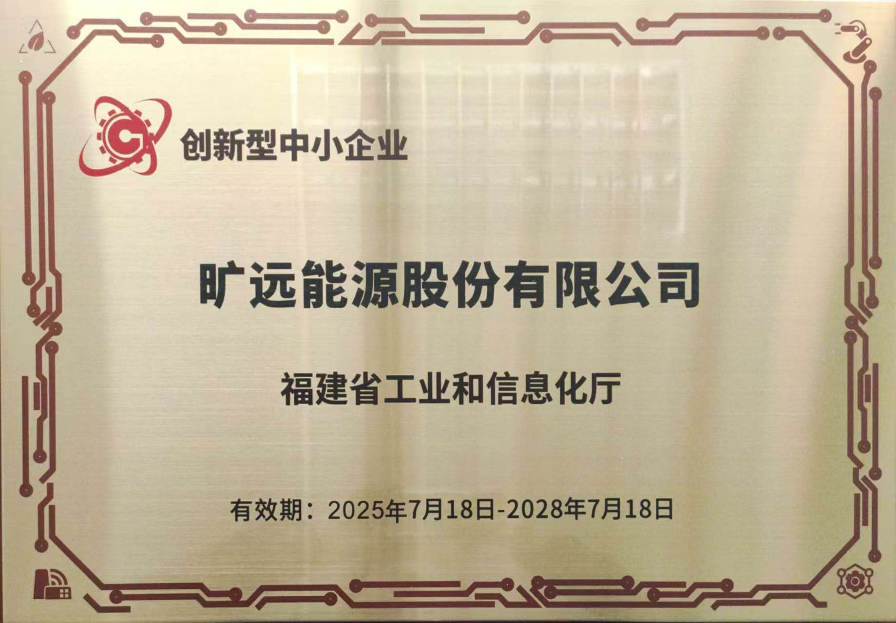 2026年3月 曠遠能源股份有限公司榮獲福建省工業(yè)和信息化廳創(chuàng)新型中小企業(yè)(有效期:2025年7月18日-2028年7月18日)