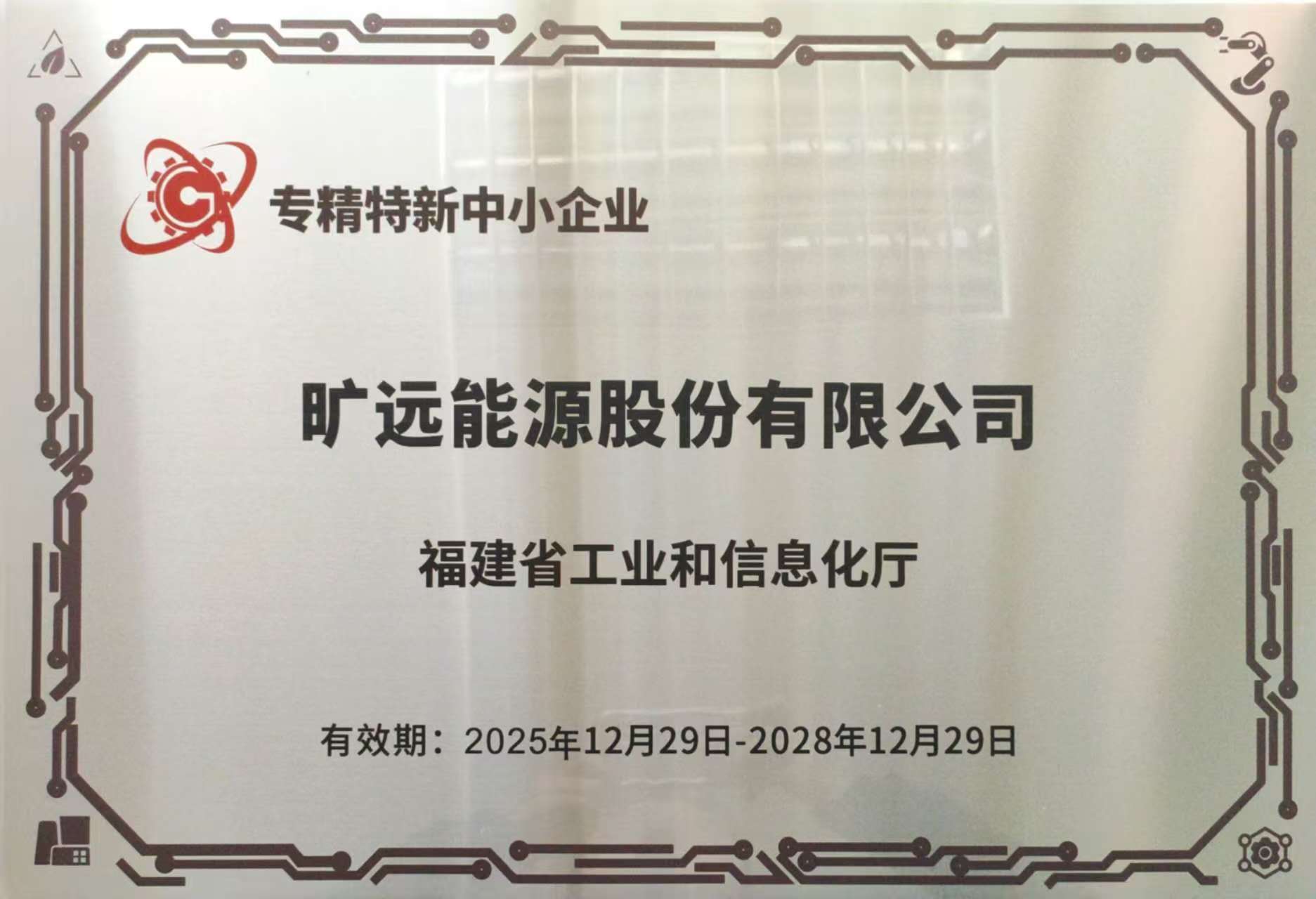 2026年3月 曠遠能源股份有限公司榮獲福建省工業(yè)和信息化廳專精特新中小企業(yè)(有效期:2025年12月29日-2028年12月29日)