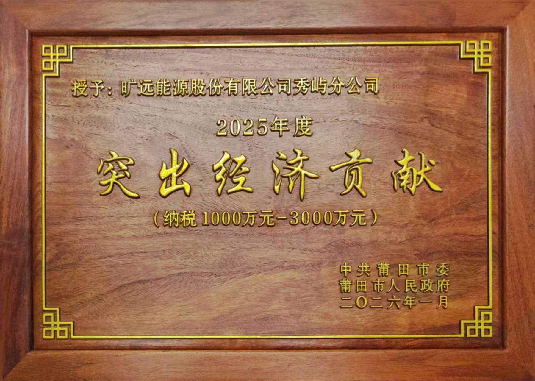 2026年1月 曠遠能源股份有限公司秀嶼分公司榮獲“2025年度突出經(jīng)濟貢獻(納稅1000萬元-3000萬元)”榮譽稱號