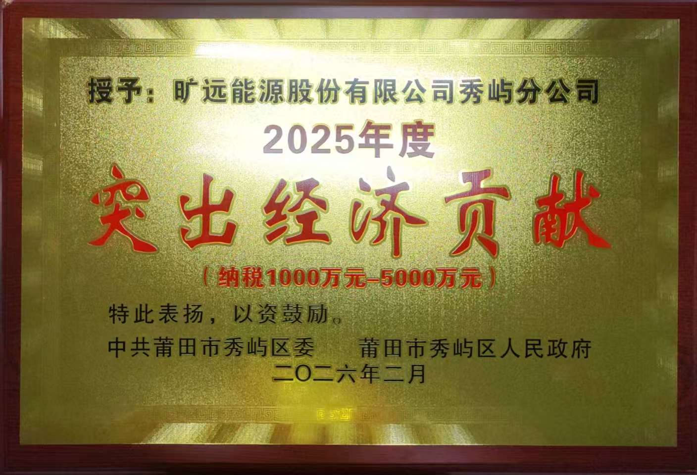 2026年2月 曠遠能源股份有限公司秀嶼分公司榮獲“2025年度突出經(jīng)濟貢獻(納稅1000萬元-5000萬元)”榮譽稱號
