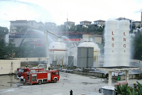 為進(jìn)一步加強(qiáng)安全生產(chǎn)應(yīng)急管理工作,提高燃?xì)庑孤┩话l(fā)事故的應(yīng)急處置能力,檢驗罐區(qū)消防設(shè)施的有效性,最大限度地減少燃?xì)庑孤┦鹿始捌湓斐傻娜藛T傷亡和財產(chǎn)損失, 2015年12月10日下午四時許,曠遠(yuǎn)能源聯(lián)合莆田市住建局、市公安局、市質(zhì)監(jiān)局、市消防支隊、霞林派出所、莆田電視臺等單位,在城廂氣化混氣灌瓶站共同組織開展“液化石油氣泄漏事故應(yīng)急演練”。曠遠(yuǎn)能源總經(jīng)理葉春、副總經(jīng)理黃劍鋒、副總經(jīng)理胡惠、總助陳麗群、總助施偉江及相關(guān)部門主管均到達(dá)現(xiàn)場全程參與演練,全市11家燃?xì)馄髽I(yè)代表獲邀至現(xiàn)場觀摩。
