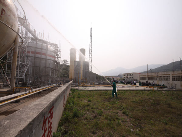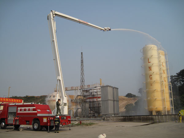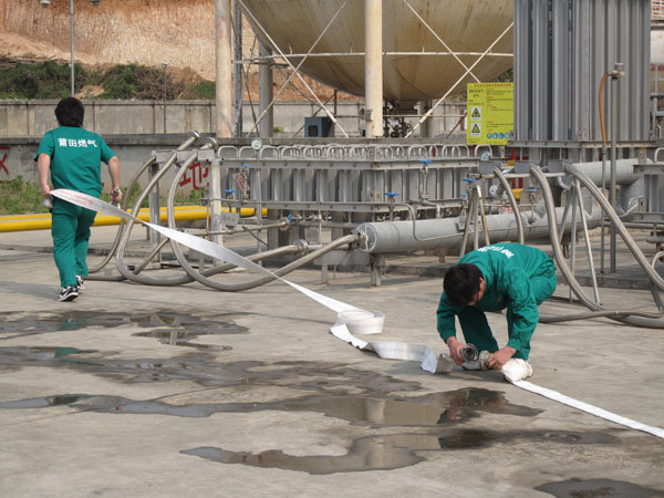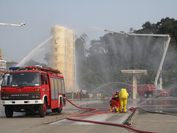 15:30分,隨著生產(chǎn)部報警聲響起,LNG灌區(qū)發(fā)生泄漏,現(xiàn)場指揮接警后立即按響報警器,指揮相關(guān)小組啟動消防水泵,對灌區(qū)進(jìn)行緊急噴淋,隔離相鄰儲罐,并組織員工按預(yù)定區(qū)域到達(dá)避難位置。市消防派出2輛高噴消防車、6輛水罐消防車到達(dá)起火現(xiàn)場,火情偵檢組隨即展開偵檢,先用泄露儀對現(xiàn)場進(jìn)行濃度檢測,并用隔離帶劃出相應(yīng)的警戒線,保安配合警戒組疏散區(qū)域內(nèi)無關(guān)人員及在場使用中的車輛熄火,同時關(guān)閉大門,禁止除消防車、搶險車外的一切車輛出入。在得知了著火位置和泄漏程度后,中隊指揮員立即下令,展開滅火行動。消防隊員穿上消防戰(zhàn)斗服、佩戴防毒面具和呼吸器、攜帶銅質(zhì)工具和滅火器材迅速趕往事故儲罐,關(guān)閉儲罐根部所有閥門。而其余消防車按照預(yù)期指定位置,全方位對LNG灌體進(jìn)行火災(zāi)撲救。
