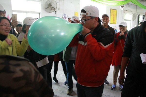 吃過午飯后,經(jīng)過一個小時的休息,拓展活動繼續(xù)進(jìn)行。下午的第一個活動為“牛皮吹破天”,要求各小組將所發(fā)全部氣球吹爆,總計時間最短的小組獲勝。裁判根據(jù)氣球頭數(shù)量核實(shí)戰(zhàn)績。游戲開始時,各小組的男士們紛紛發(fā)揮紳士風(fēng)度,爭分奪秒,氣球爆炸聲此起彼伏,為了加強(qiáng)娛樂性,裁判組分別給每個小組分發(fā)一個大氣球,每次大氣球的吹爆過程都能引來隊(duì)員們的側(cè)目相看,隊(duì)員們臉上露出各異的表情,或驚奇,或興奮,或賊笑……